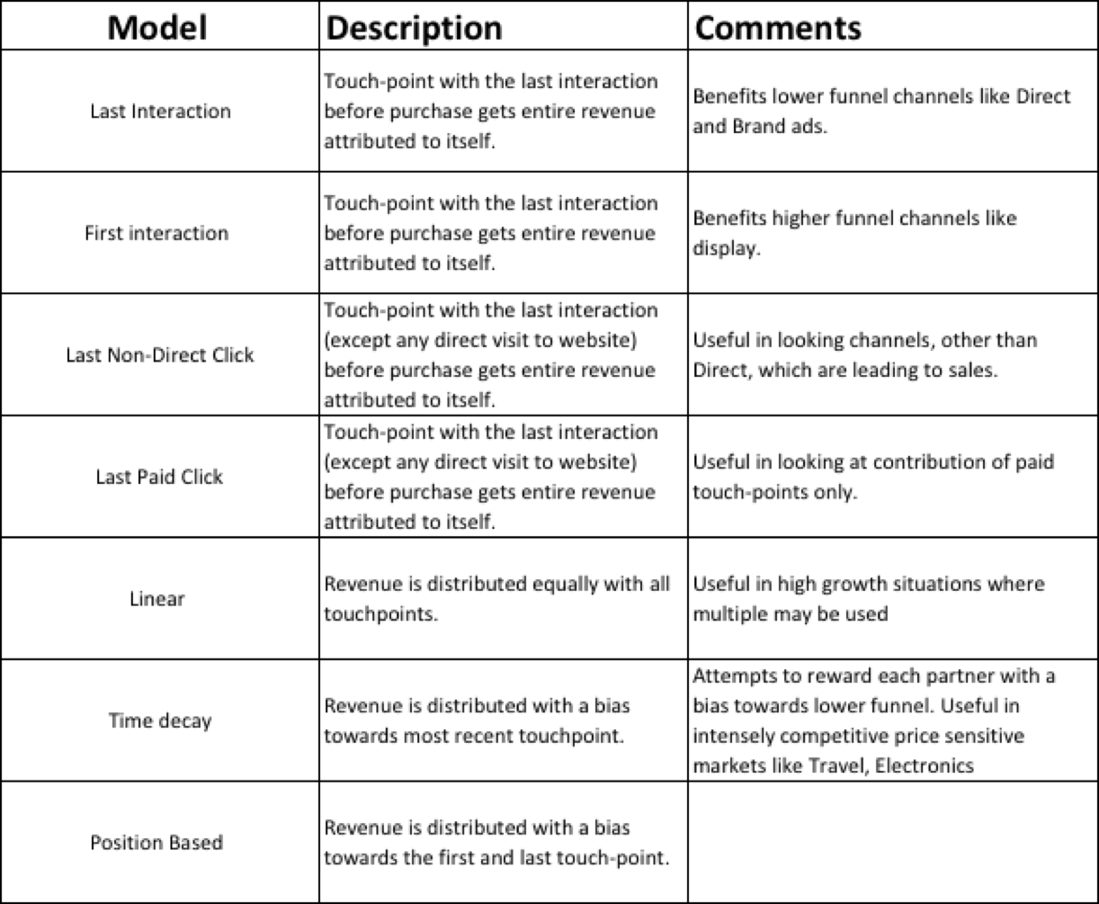 For example, a last paid-click model might be in use to compare the efficiency of paid channels on revenue, while ignoring free channels like Direct visitors, Email and Organic. At the same time, a First Interaction model might be required to measure the effectiveness of marketing channels in introducing new visitors down the funnel.